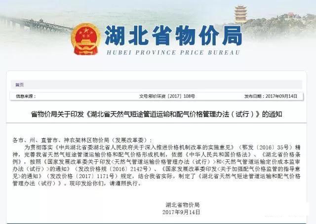 2017年發(fā)改委《關(guān)于核定天然氣跨省管道運(yùn)輸價(jià)格的通知》,根據(jù)《天然氣管道運(yùn)輸價(jià)格管理辦法(試行)》和《天然氣管道運(yùn)輸定價(jià)成本監(jiān)審辦法(試行)》有關(guān)規(guī)定,對中石油北京天然氣管道有限公司等13家跨省管道運(yùn)輸企業(yè)進(jìn)行了定價(jià)成本監(jiān)審,核定了中石油北京天然氣管道有限公司等13家跨省管道運(yùn)輸企業(yè)管道運(yùn)輸價(jià)格。自2017年9月1日起執(zhí)行。